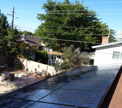 I was going to install Schott Solar panels as they are locally made here in Albuquerque and cheaper. But they don’t have the all black panels and I admit to being vain. I was given an address to check out some Schott panels installed near campus. Rode my bicycle over to see them a couple of months before  having my panels installed. Decided then and there that the silver panels are fine for business rooftops or for a solar “farm” out in a distant field…but not for my rooftop.  I just didn’t like the silver edged panels nearly as much, and since I will be seeing these panels on my roof for the next 30 years…well…I went all black. They blend in more.
